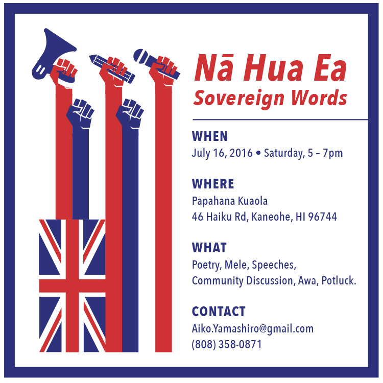 Nā Hua Ea: Sovereign Words will be held Saturday, July 16th, 2016, from 5 – 7 pm at Papahana Kuaola. We hope you can make it!
